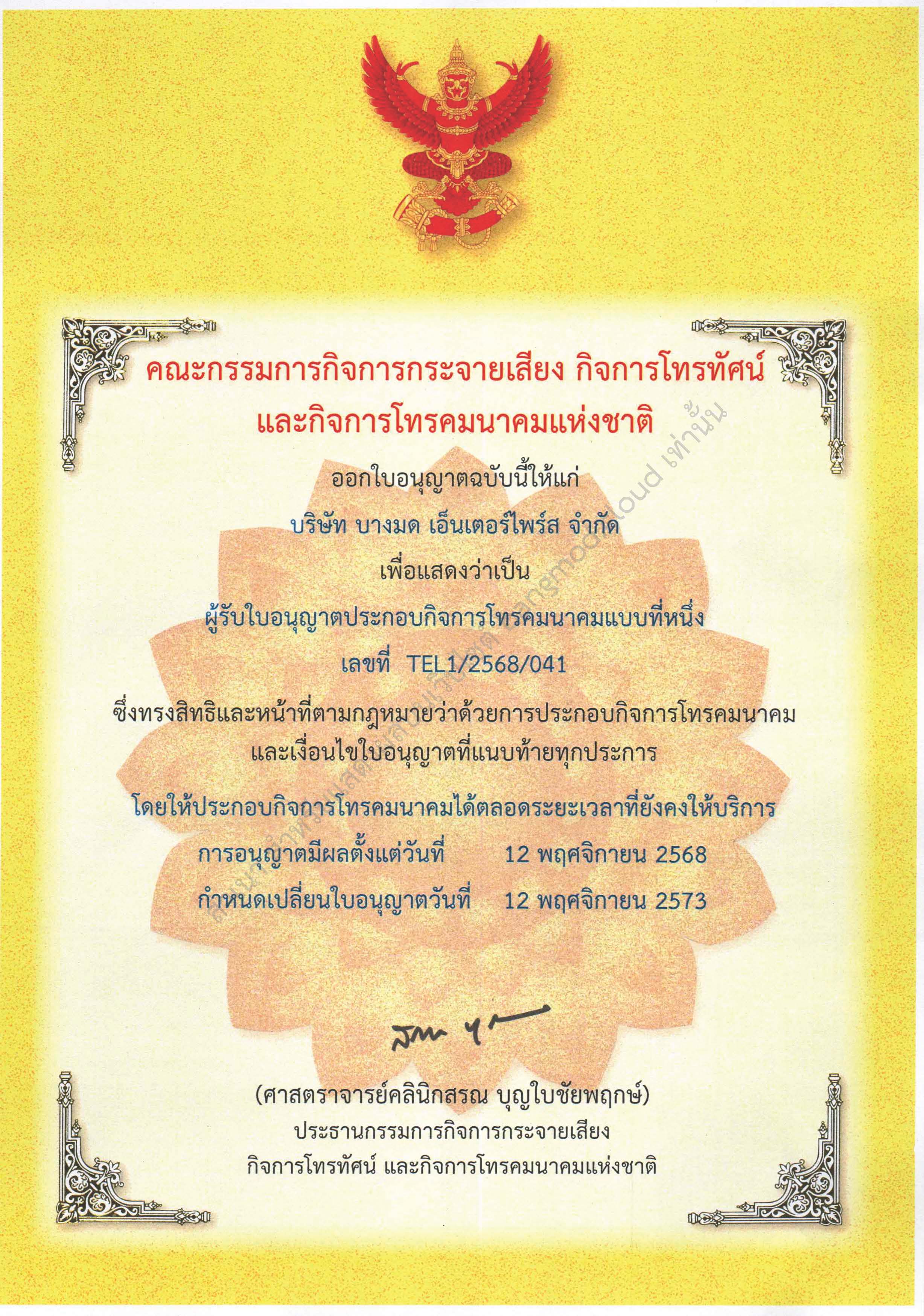 บริษัท บางมด เอ็นเตอร์ไพร์ส จำกัด ได้รับ ใบอนุญาตประกอบกิจการโทรคมนาคมแบบที่ 1 จากคณะกรรมการกิจการกระจายเสียง กิจการโทรทัศน์ และกิจการโทรคมนาคมแห่งชาติ (กสทช.) โดยมีผลอย่างเป็นทางการตั้งแต่วันที่ 12 พฤศจิกายน 2568